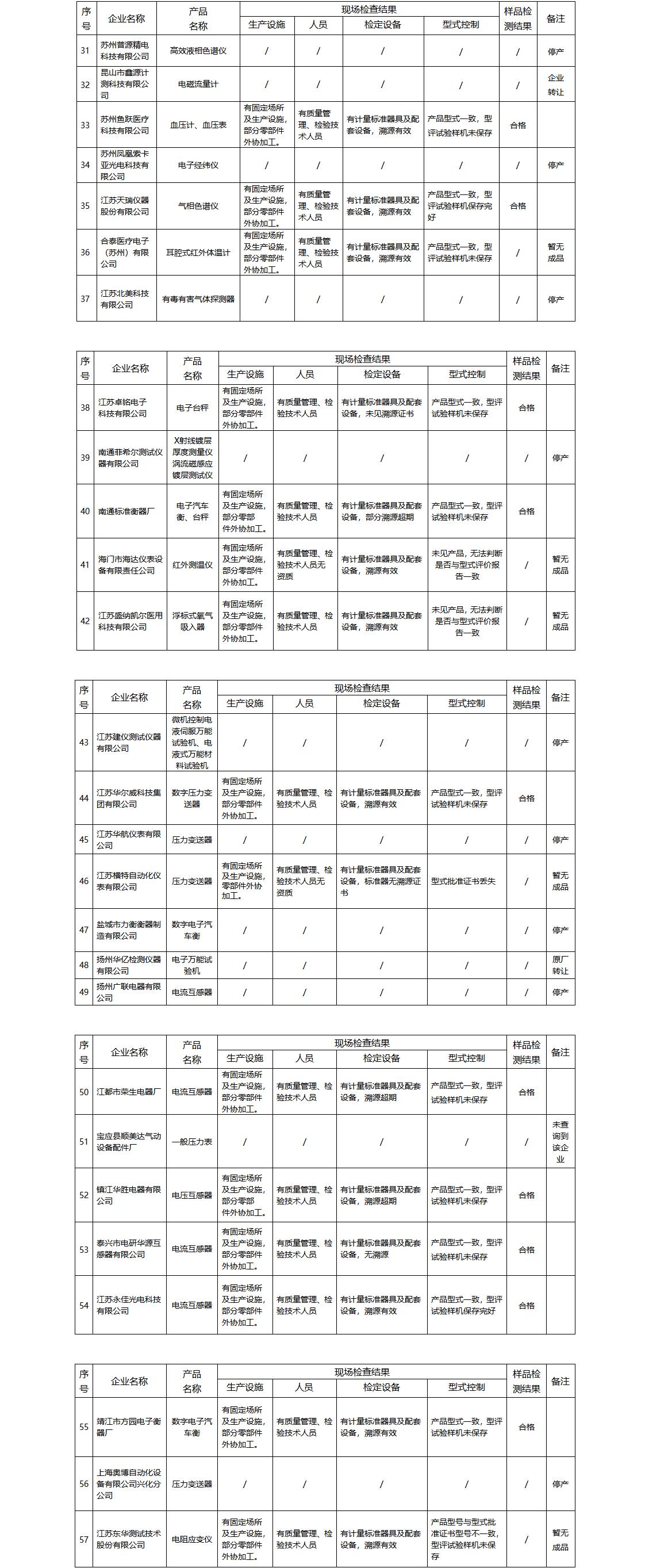 經(jīng)查,16家企業(yè)處于關(guān)停并轉(zhuǎn)狀態(tài),現(xiàn)場(chǎng)檢查了處于正常生產(chǎn)狀態(tài)的41家企業(yè)的生產(chǎn)和型評(píng)相關(guān)情況。因計(jì)量器具的生產(chǎn)多是根據(jù)訂單需求生產(chǎn)而沒(méi)有庫(kù)存產(chǎn)品,所以部分企業(yè)未能現(xiàn)場(chǎng)抽樣,本次檢查共抽檢樣品32批次。