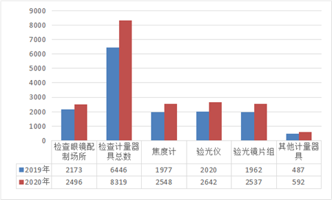 全省共檢查眼鏡配制場(chǎng)所2496家,比2019年增加323家;檢查計(jì)量器具8319臺(tái),比2019年增加1873臺(tái);其中檢查焦度計(jì)2548臺(tái)、驗(yàn)光儀2642臺(tái)、驗(yàn)光鏡片組2537臺(tái),其他計(jì)量器具592臺(tái)。