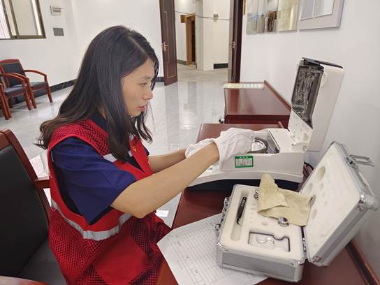 ↑市計(jì)量測(cè)試所黨員專家團(tuán)隊(duì)在生產(chǎn)廠內(nèi)免費(fèi)檢定計(jì)量器具