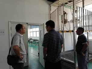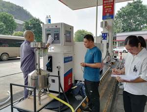 圖為考核組專家對車用尿素溶液加注機檢定裝置進行現(xiàn)場考核