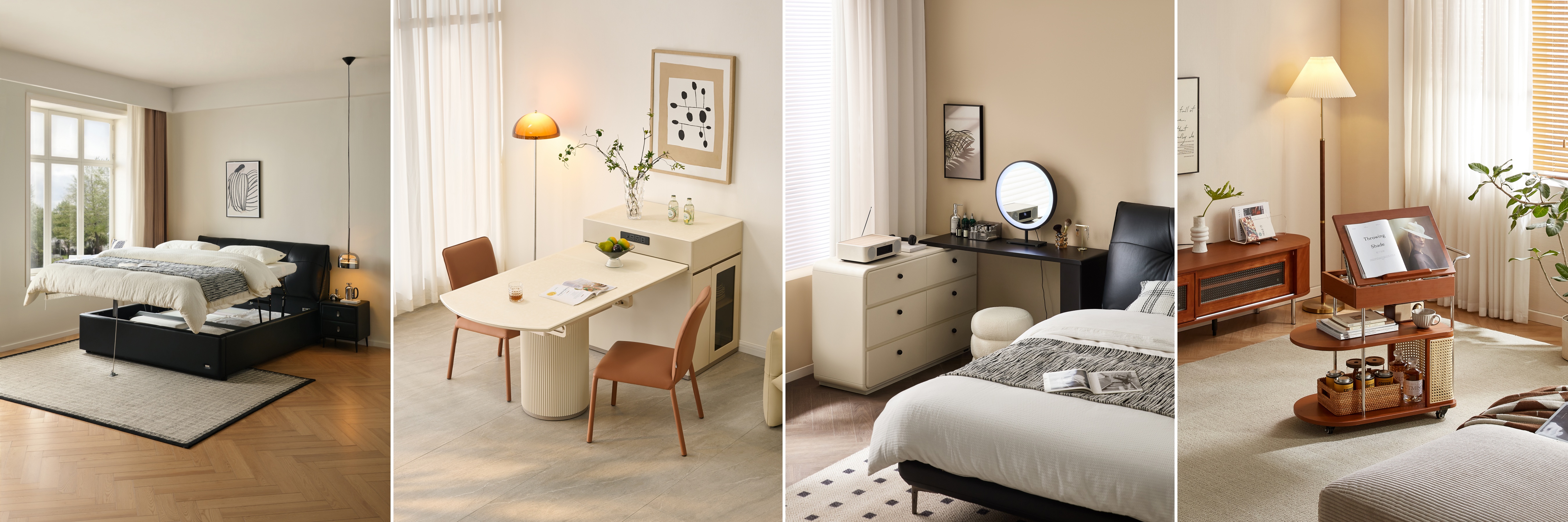自帶儲(chǔ)物空間的箱體軟床,換季被褥、行李箱輕松收納;可折疊島臺(tái)餐桌,日常收起不占地,親友歡聚時(shí)秒變大氣餐桌,側(cè)面預(yù)留收納格,餐具隨手可?。粫?shū)桌妝臺(tái)一體設(shè)計(jì),可一字型靠墻辦公,也可L型布局變身梳妝區(qū),收納儲(chǔ)物一步到位;可移動(dòng)小邊幾,客廳臥室隨意切換,既是茶幾又是床頭柜,靈活適配每個(gè)角落。從客廳到臥室,從收納到功能,精準(zhǔn)破解小戶型擁擠、收納不足的痛點(diǎn),真正實(shí)現(xiàn)小空間大利用,讓家整潔有序,通透開(kāi)闊。